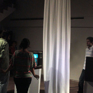 The installation incorporated a fabric, hanging between the two old television sets. Each television set has video of pedestal fan on. The curtain is given a wind like movement leaving the viewers perplexed about the fans in the video and the source of the wind.